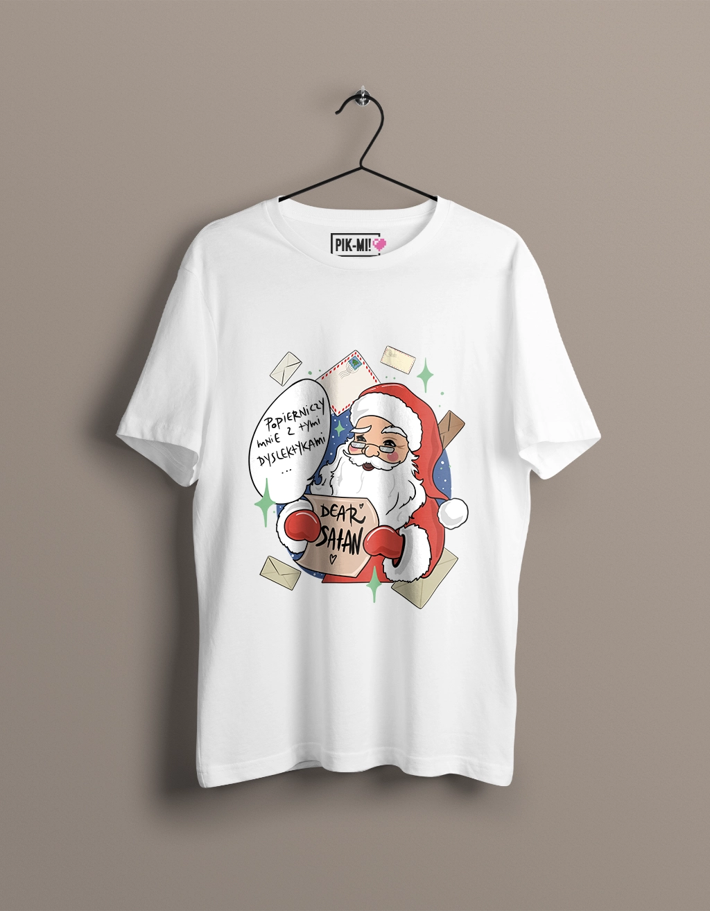 Nie każda literówka kończy się niewinnie… Zwłaszcza gdy trafia do Mikołaja! Ta koszulka to mistrzowska gra słów i świąteczny żart, który łączy czarny humor z bożonarodzeniowym klimatem. Nadruk przedstawia Mikołaja czytającego list z napisem „Dear Satan” oraz jego przemyślenia: „Popierniczy mnie z tymi dyslektykami”. Całość dopełniają dwa bałwanki, które tylko pogłębiają absurd sytuacji.
