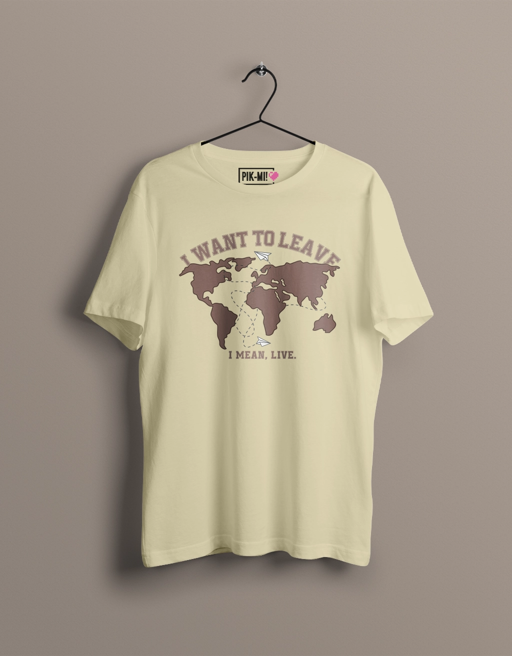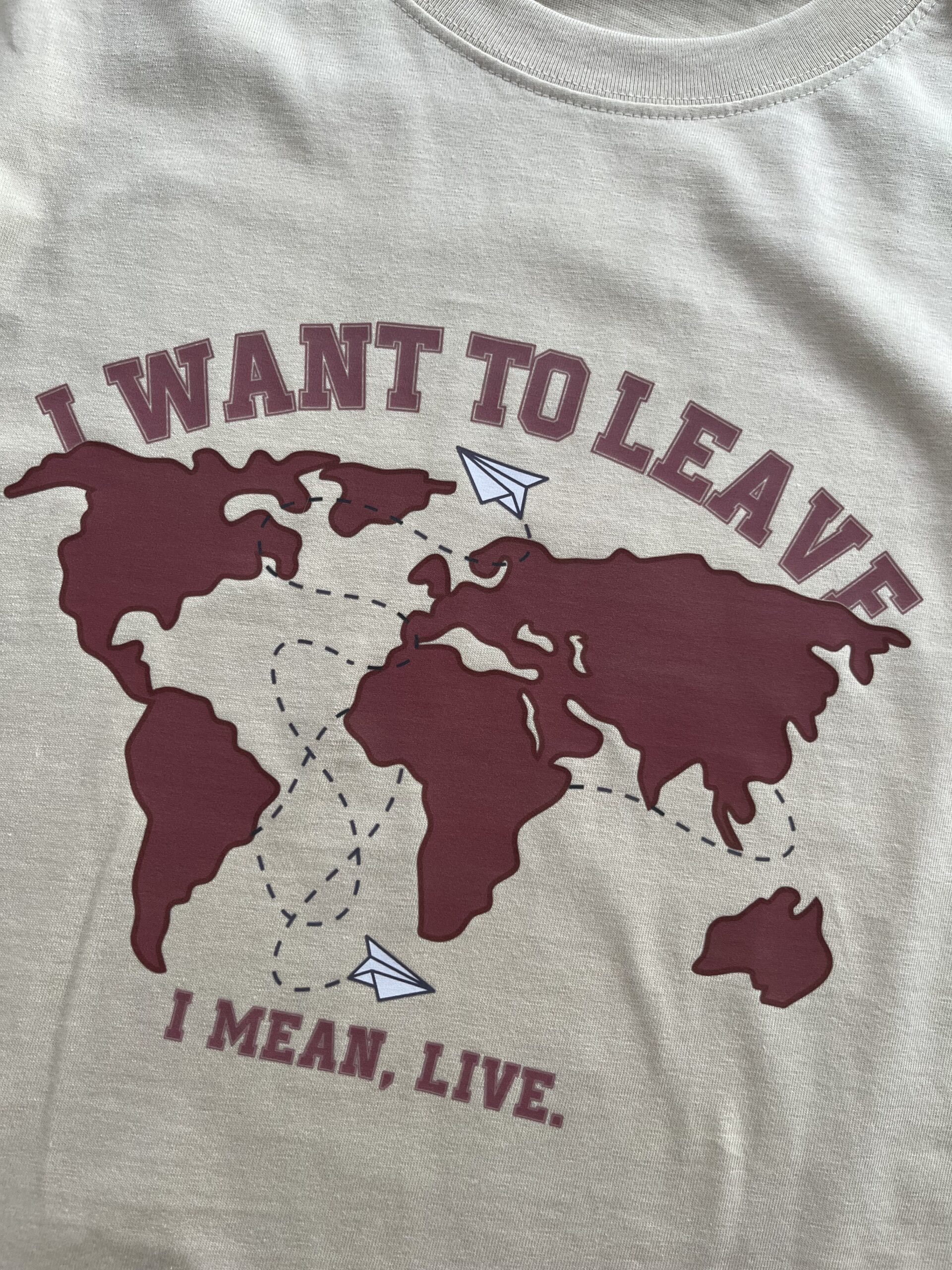 Dla tych, którzy marzą o ucieczce w nieznane… albo po prostu potrzebują chwili oddechu. Koszulka z napisem „I want to leave, I mean live” i nadrukiem mapy świata to idealna propozycja dla podróżników, cyfrowych nomadów i wszystkich, którzy czują, że życie zaczyna się tam, gdzie kończy się strefa komfortu.