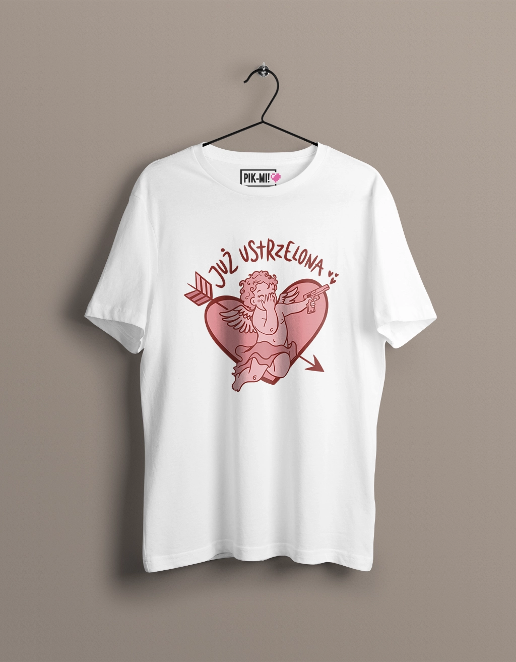 Ta koszulka to idealny wybór dla osób, które lubią walentynkowe motywy podane z humorem i lekkim pazurem. Ilustracja przedstawia uroczego aniołka‑kupidyna, który zamiast klasycznego łuku trzyma… pistolet, a całość dopełnia napis „już ustrzelona”. To projekt, który bawi, zaskakuje i świetnie sprawdza się jako prezent dla partnerki — szczególnie jeśli w Waszym związku króluje żartobliwe przekomarzanie.
