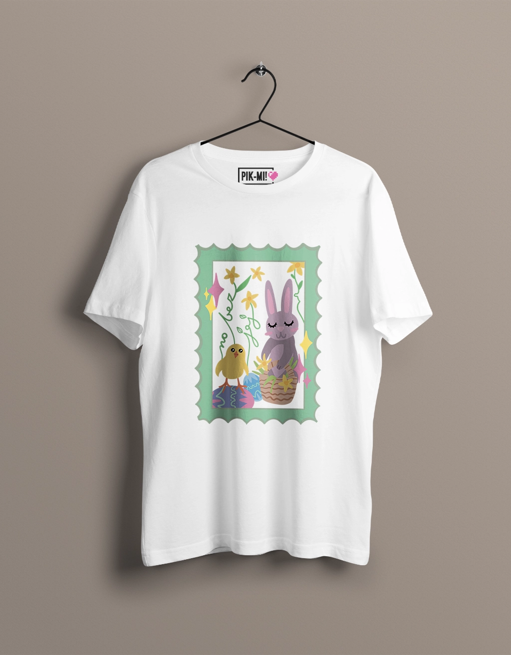 Ta koszulka to idealny wybór na Wielkanoc dla osób, które lubią połączyć uroczy świąteczny klimat z lekkim, żartobliwym akcentem. Ilustracja przedstawia zająca wielkanocnego i małego kurczaczka, a w kompozycję sprytnie wpleciony jest ukryty napis „no bez jaj”. Efekt jest jednocześnie słodki i zabawny — idealny na rodzinne spotkania, świąteczne zdjęcia i jako prezent.