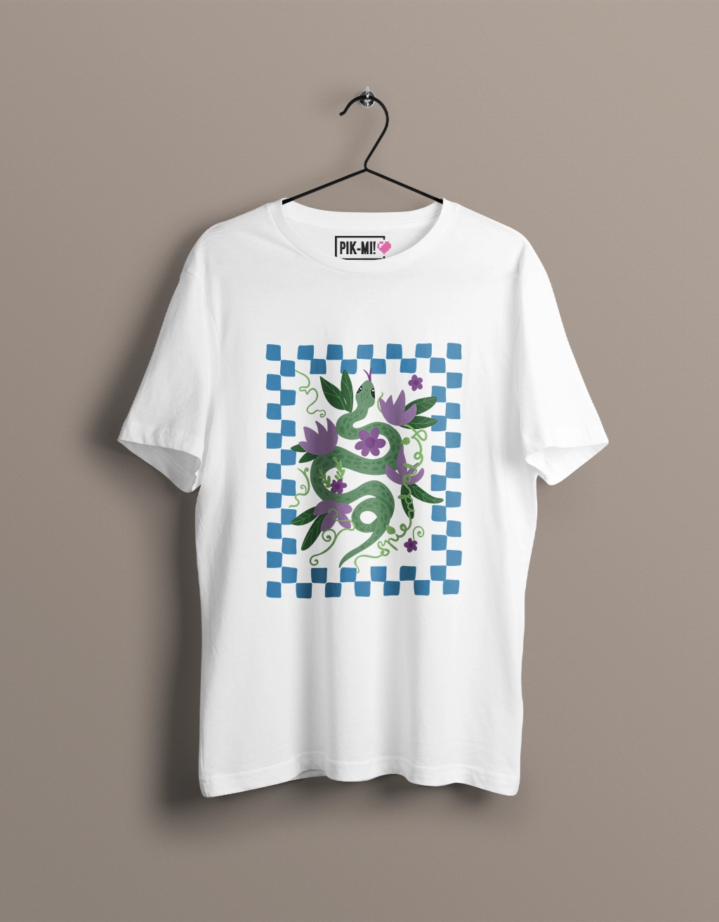 - Oryginalna ilustracja – wąż w kwiatach tworzy estetyczny, lekko mistyczny motyw