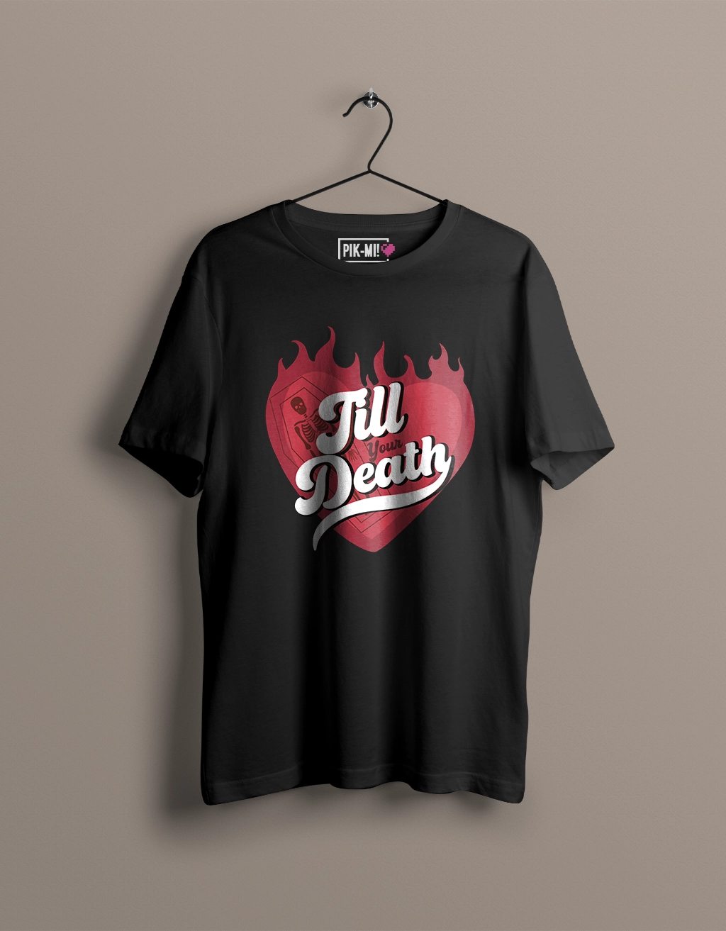 Ta koszulka to idealny wybór dla osób, które kochają alternatywny styl i symboliczne, nieoczywiste grafiki. Ilustracja przedstawia serce z kościotrupem spoczywającym w trumnie, tworząc mocny motyw, który łączy romantyzm z mroczną estetyką. Całość dopełnia napis „till your death”, nadający projektowi intensywny, emocjonalny charakter. To koszulka, która wyróżnia się na ulicy i świetnie wpisuje się w klimat dark romance i tattoo‑style.