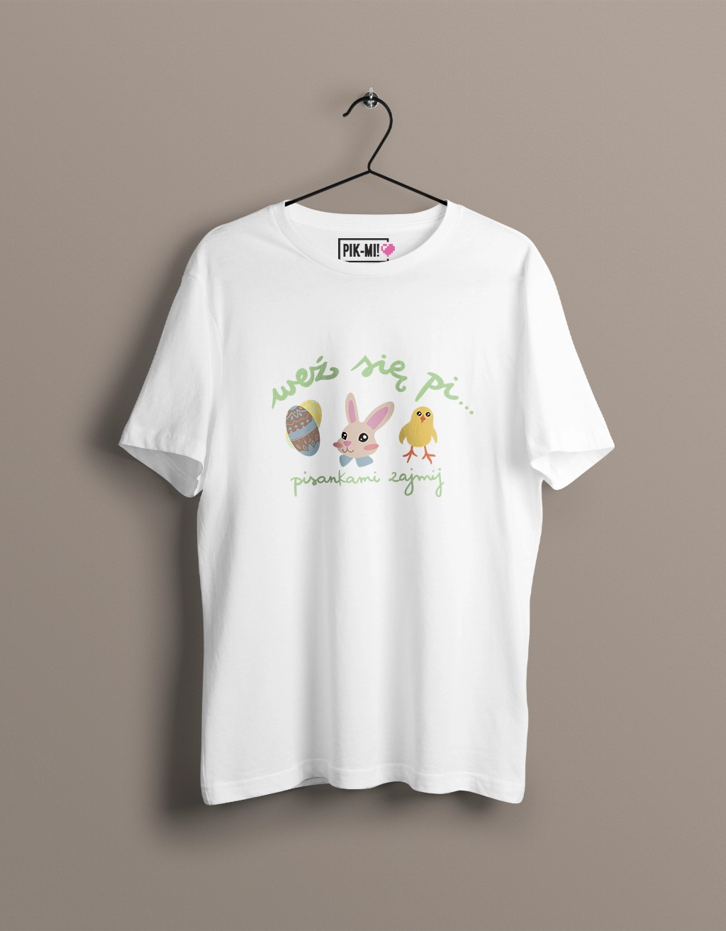 Ta koszulka to idealny wybór dla osób, które lubią połączyć wielkanocną słodycz z odrobiną bezczelnego humoru. Ilustracja przedstawia pisanki, uroczego króliczka wielkanocnego i malutkiego kurczaczka, a całość dopełnia przewrotny, żartobliwy napis „weź się pi….. sankami zajmij”. To projekt, który bawi, zaskakuje i świetnie sprawdzi się jako świąteczny prezent dla osób z dystansem i poczuciem humoru.